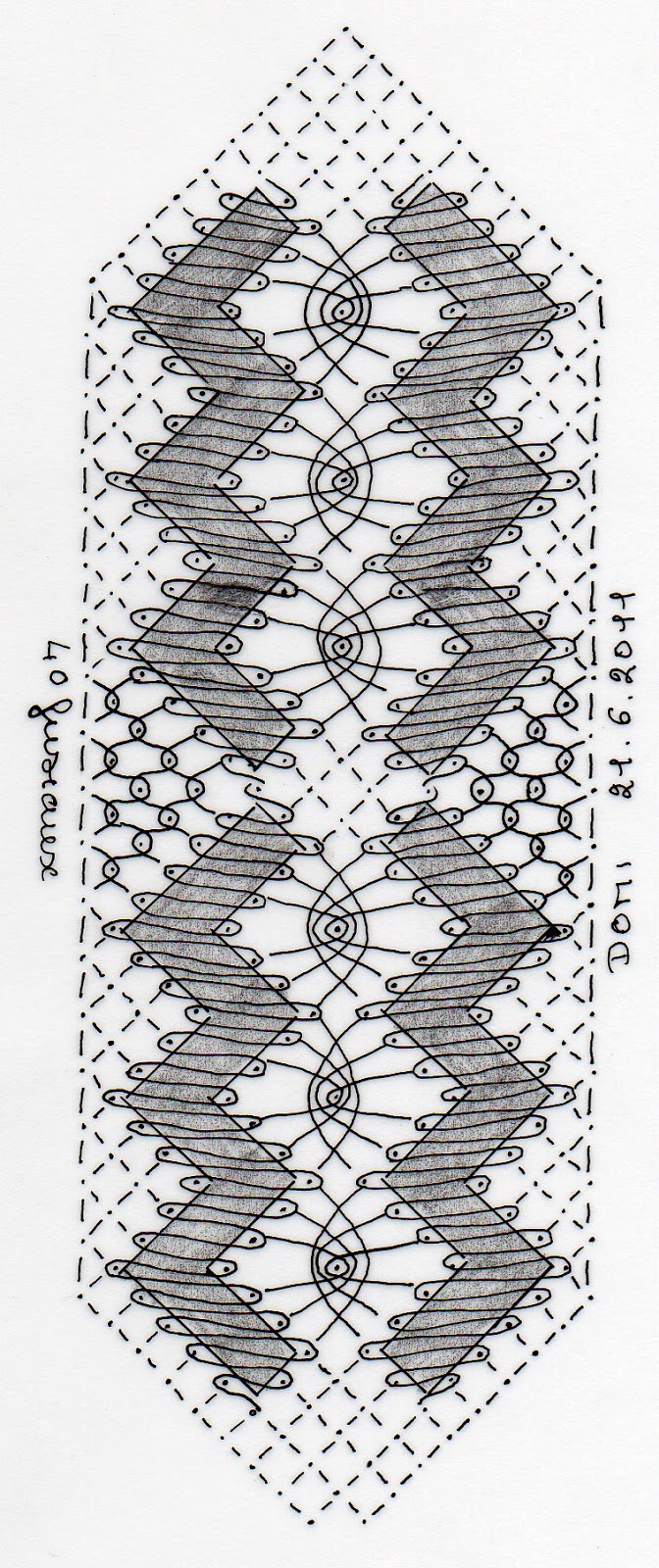 RépondreSupprimerBonjour, Comme indiqué, il faut 20 paires de fuseaux. 2 paires à la pointe, qui partiront chacune d'un côté, puis une paire à chaque épingle. Bonne réalisation.